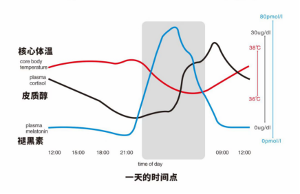 健康人皮质醇、褪黑素和体温的昼夜变化[5]