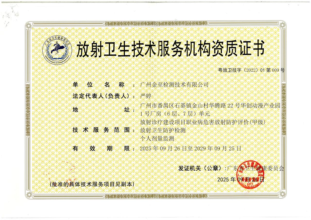 此次资质升级标志着金至检测在放射卫生技术服务内容从仅限常规X射线影像诊断项目扩展至放疗、核医学等所有类型的放射诊疗建设项目,是技术能力的全面提升。可为医疗机构提供放射诊疗建设项目全周期技术支持。